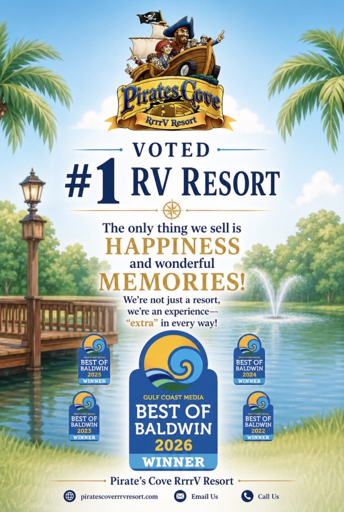 Pirates Coves RV Resort opened May 15, 2020 and has been voted best in Baldwin County for the fifth time now . Come see for yourself! We love what we do, and we love people. We aren’t like any other place. We are extra!