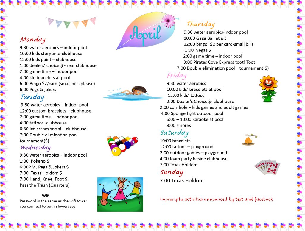 Winter Snowbirds have scheduled activities that include water aerobics in our beautiful heated indoor pool. We have water volleyball. Card games include poker, bingo, and game night! Clubs and Bible study. Themed dances, events, and more! We do weekly potlucks for breakfast and supper. We have many scheduled craft activities and some premium activities, such as painting classes. We treat you like family!